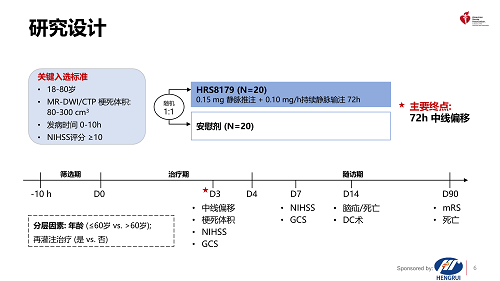 注射用HRS8179是由博天堂918自主研发的创新药,是磺酰脲类受体1(SUR1)阻断剂,能够阻断SUR1/TRPM4离子通道,减少Na+内流,从而减轻LHI后继发的脑水肿、降低死亡率,改善神经功能4,5。HRS8179-201研究旨在评估HRS8179在LHI患者中的有效性和安全性。